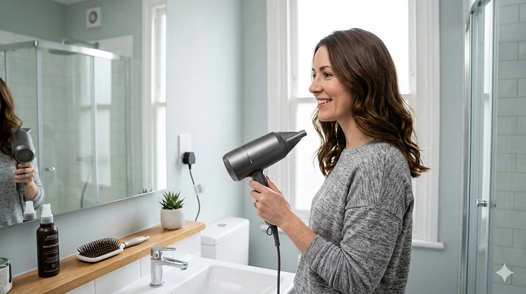 Hold your dryer 15-20 centimetres from your head—close enough for efficiency, far enough for safety. Keep it moving continuously rather than focusing heat on one area. Direct airflow down the hair shaft (root to tip) to smooth cuticles and enhance shine.